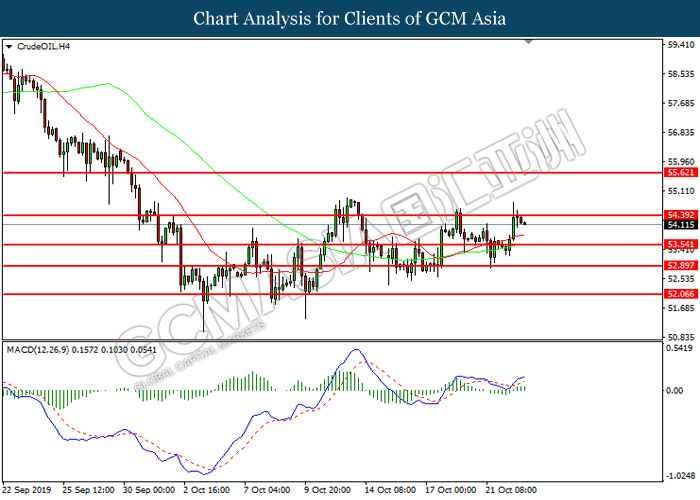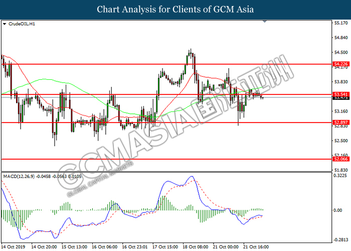 CrudeOIL, H1: Crude oil price was traded within a range while currently testing the resistance level at 53.55. MACD which illustrated diminishing bullish momentum suggest its price to be traded lower in short-term.