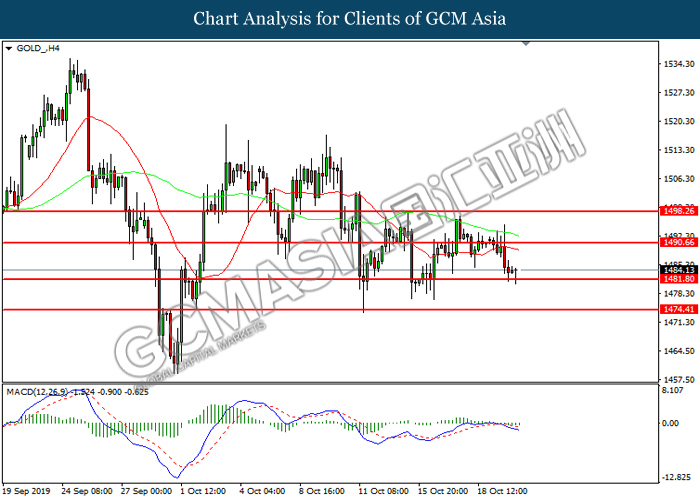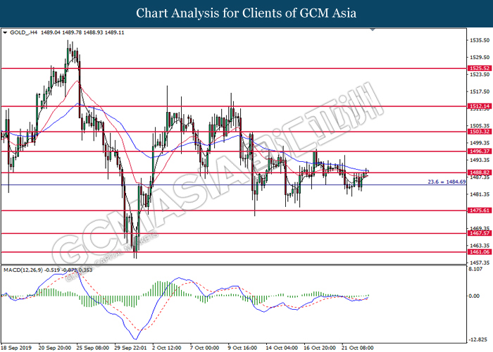 GOLD_, H4: Gold price remains traded within a sideways channel formation. MACD which illustrate bearish signal suggests its price to extend losses after closing below 1484.05.