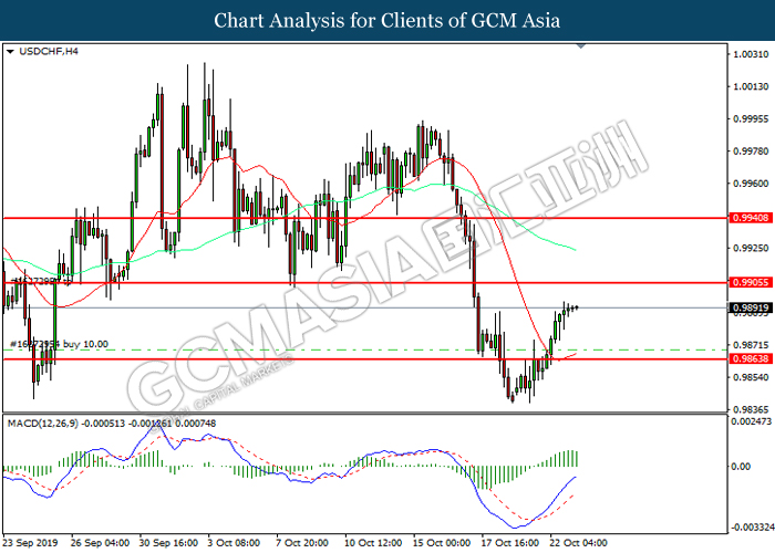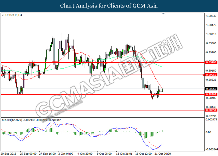 USDCHF, H4: USDCHF was traded higher following prior rebound from the support level at 0.9850. MACD which illustrated increasing bullish momentum suggest the pair to extend its gain toward the resistance level at 0.9905.