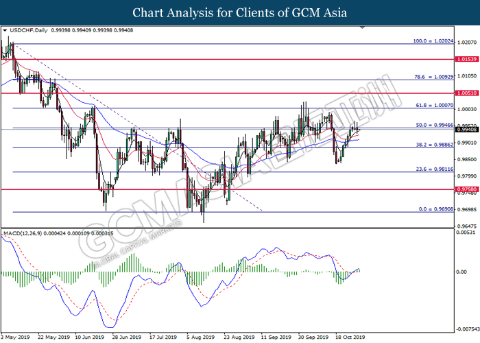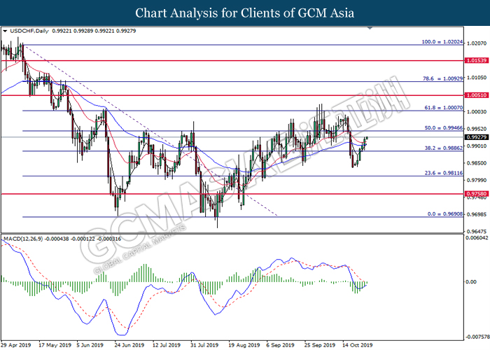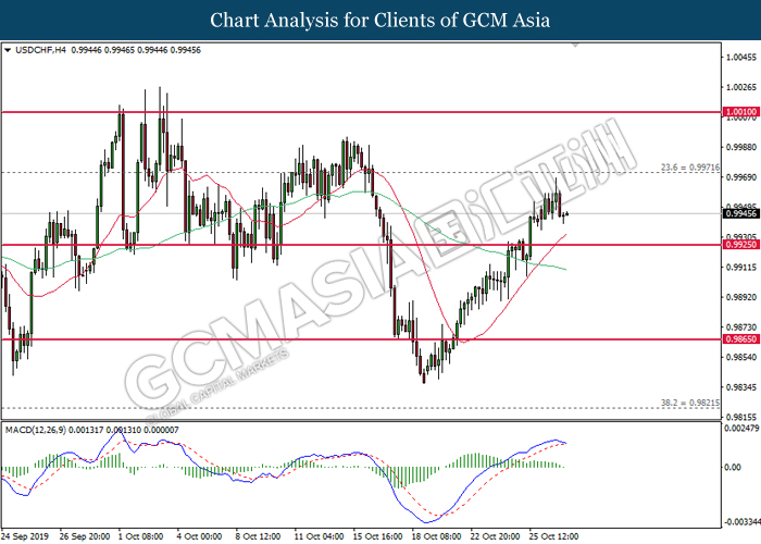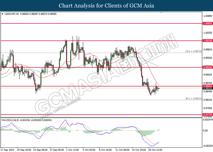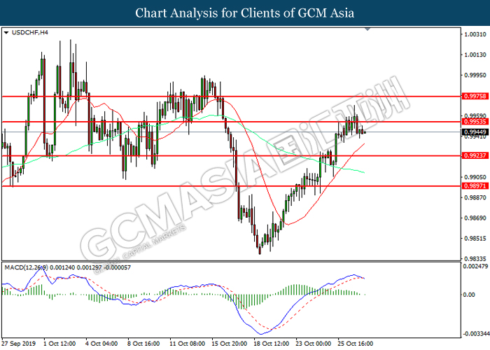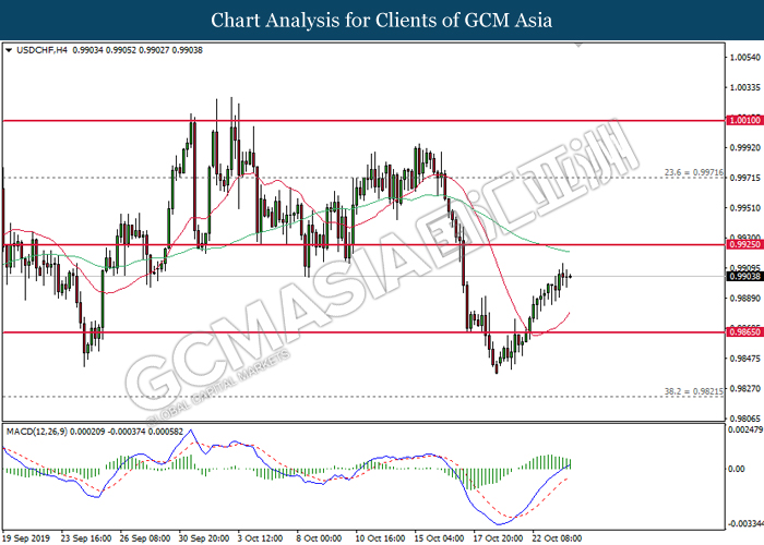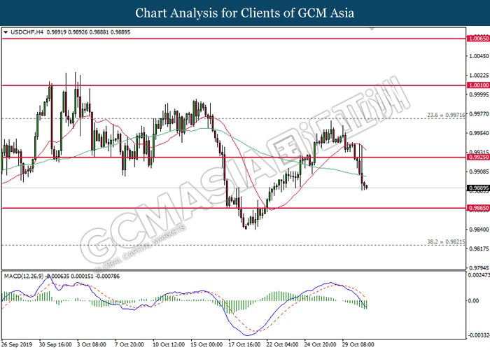 Greenback extended its losses after Federal Reserve cut its interest rate in a bid to circumvent any recession risks that arises due to ongoing global trade war. In a highly expected decision, Fed cut its interest rate by 25 basis points with 8 policymakers voted in favor while two opposed of the action. The divided opinion among policymakers came due to mixed economic signals from recently released data. While economic growth has slowed significantly, it has held better than expected, diminishing slightly from 2% rate as seen in the last quarter. However, manufacturing and business investments continues to fall due to rising uncertainty from US-China trade war and other trade disputes. In the press conference, Fed Chair Jerome Powell suggested that the central bank would hold off from cutting its interest rates further for a foreseeable future. Powell commented that the current interest rate level is “appropriate” and “in-line” with Fed’s economic outlook of moderate economic growth, coupled with resilient labor market and inflation hovering at 2%. For the time being, investors would continue to scrutinize upcoming economic data releases from the United States in order to gauge the stance of Federal Reserve when they meet for policy meeting at the end of the year. As of writing, the dollar index was quoted down 0.25% to 97.20 while pair of USD/CHF slumped 0.51% to 0.9890.