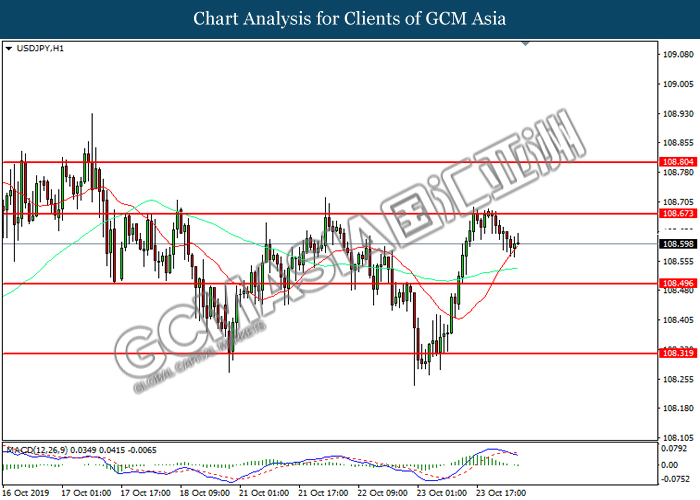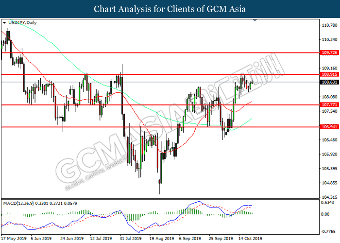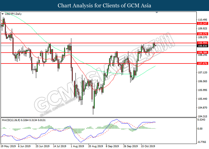 USDJPY, Daily: USDJPY was traded higher while currently near the resistance level at 108.90. However, MACD which illustrated diminishing bullish momentum suggest the pair to be traded lower in short-term as technical correction.