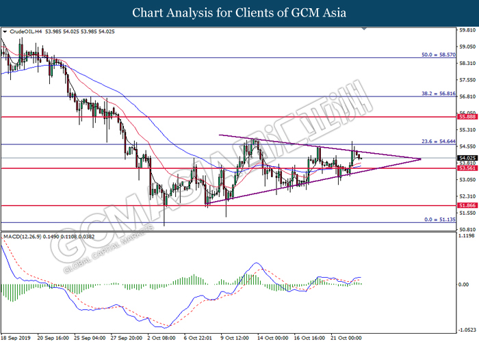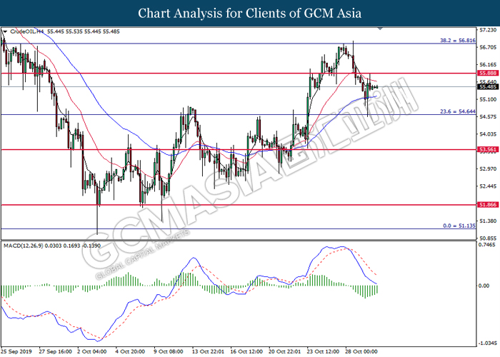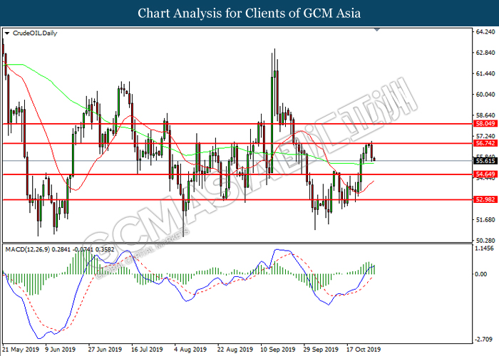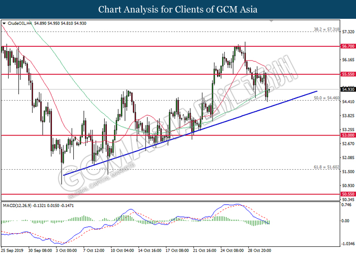 CrudeOIL, H4: Crude oil price was traded higher following prior rebound from the support of 54.45. MACD which illustrate diminished downward momentum suggests its price to be traded higher, towards the direction of 55.55.