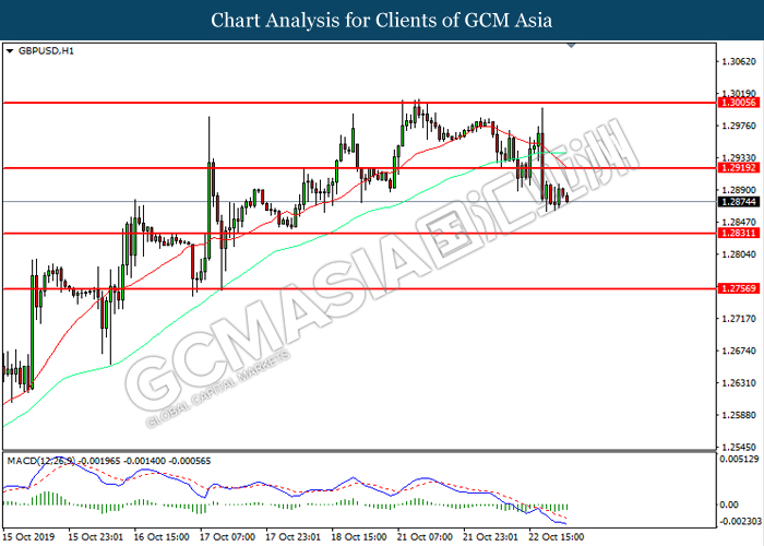 GBPUSD, H1: GBPUSD was traded within a range while currently testing near the support level at 1.2850. MACD which illustrated bearish momentum suggest the pair to be traded lower after it successfully breakout below the support level.