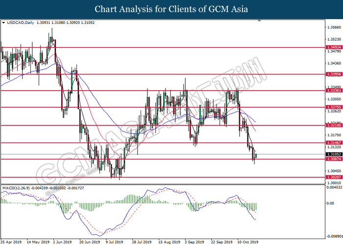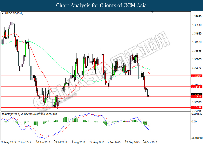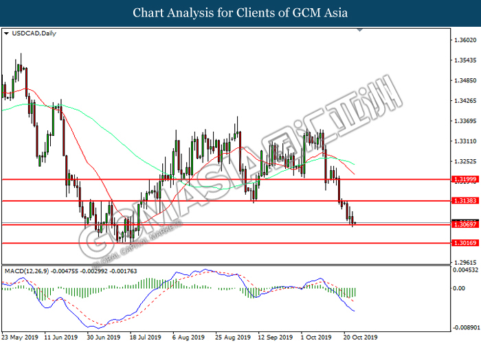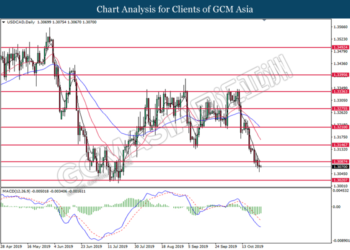 USDCAD, Daily: USDCAD was traded lower while currently testing the support level at 1.3075. MACD which illustrated increasing bearish momentum suggest the pair to extend its losses after it successfully breakout below the support level.