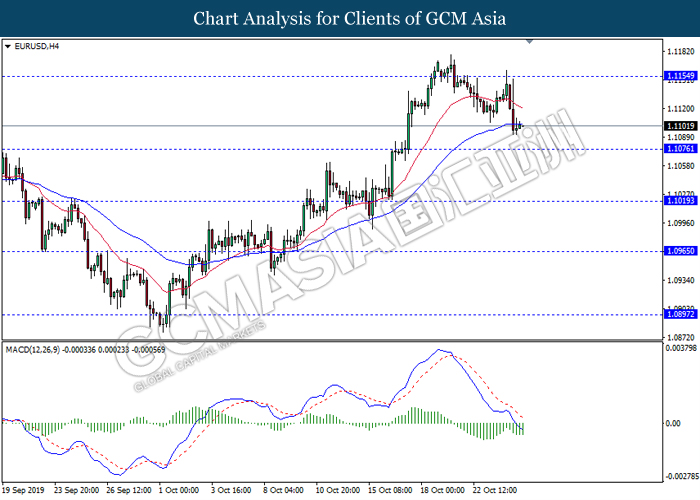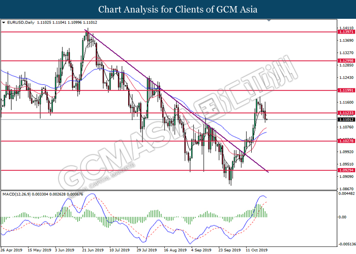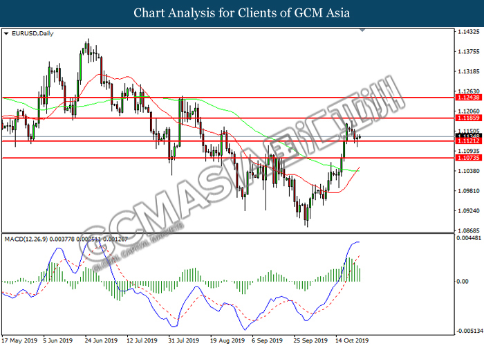 EURUSD, Daily: EURUSD was traded higher following prior rebound from the support level at 1.1070. However, MACD which illustrated diminishing bullish momentum suggest the pair to be traded lower in short-term as technical correction.