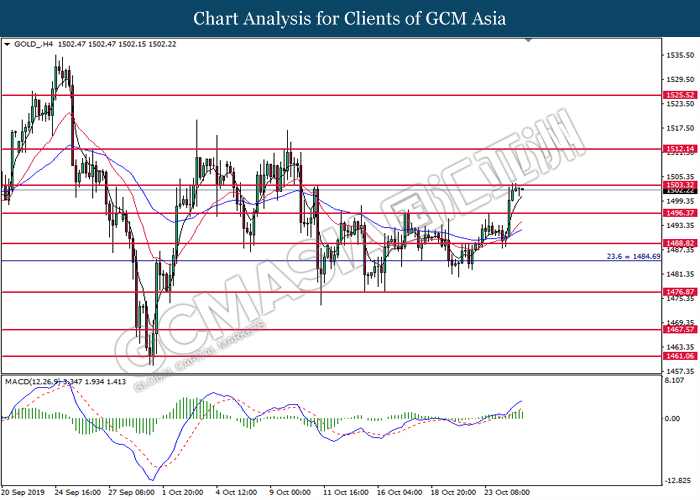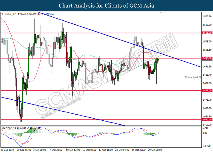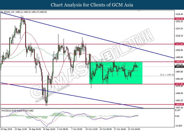GOLD_, H4: Gold price was traded higher while currently testing at the resistance of 1496.00. MACD which illustrate bullish signal suggests its price to be traded higher after a breakout occur at 1496.00.
