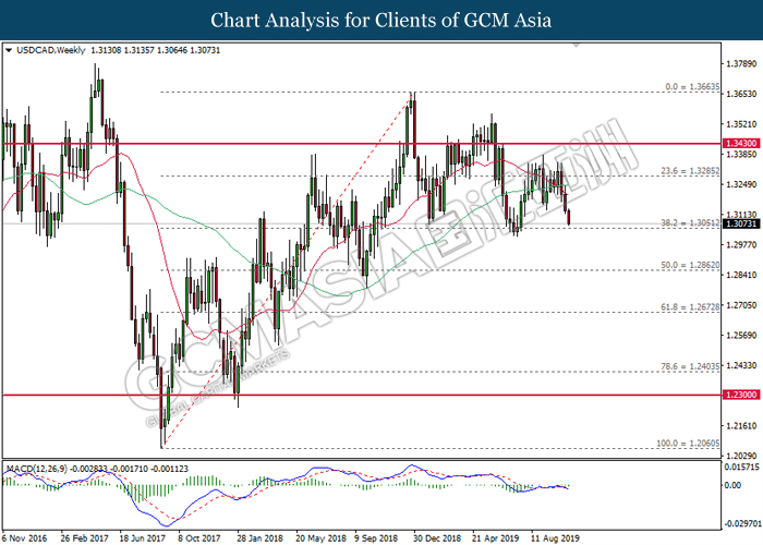 USDCAD, Weekly: USDCAD was traded lower following prior retrace from 1.3285. MACD which illustrate bearish signal suggests the pair to extend its losses, towards the direction of 1.3050.