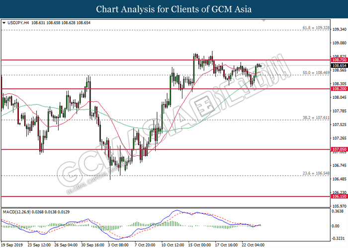 USDJPY, H4: USDJPY was traded lower while currently testing the support of 108.75. MACD which illustrate bearish signal suggest the pair to extend its losses after closing below the support level.