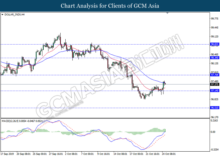 DOLLAR_INDX, H1: Dollar index was traded lower after closing below the support of 97.35. MACD which illustrate bearish signal suggests the index to extend its losses, towards the direction of 97.15.