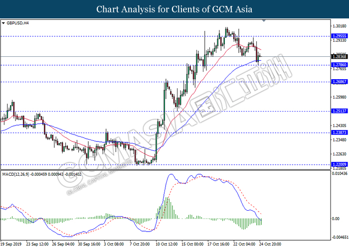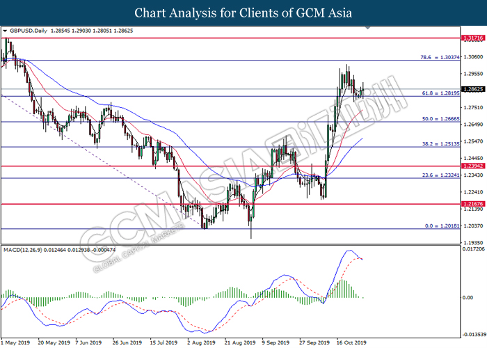 GBPUSD, Daily: GBPUSD was traded lower following prior retracement from the higher level. MACD which begins to form bearish signal suggests the pair to extend its losses toward the support level at 1.2820.