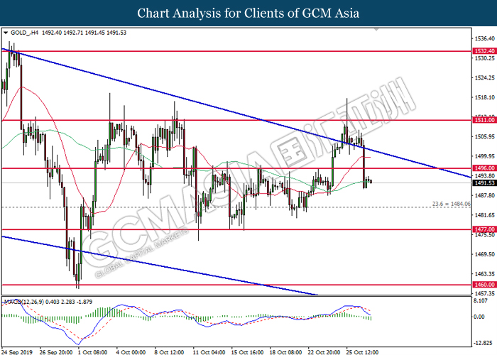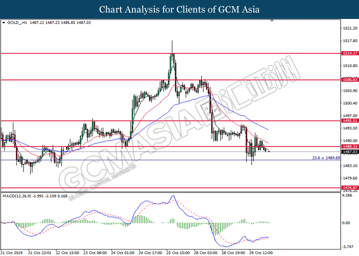 GOLD_, H4: Gold price was traded lower following prior retracement from the 50 moving average line (Blue). MACD which illustrate diminishing upward momentum suggest its price to extend its losses toward the support level at 1485.60.