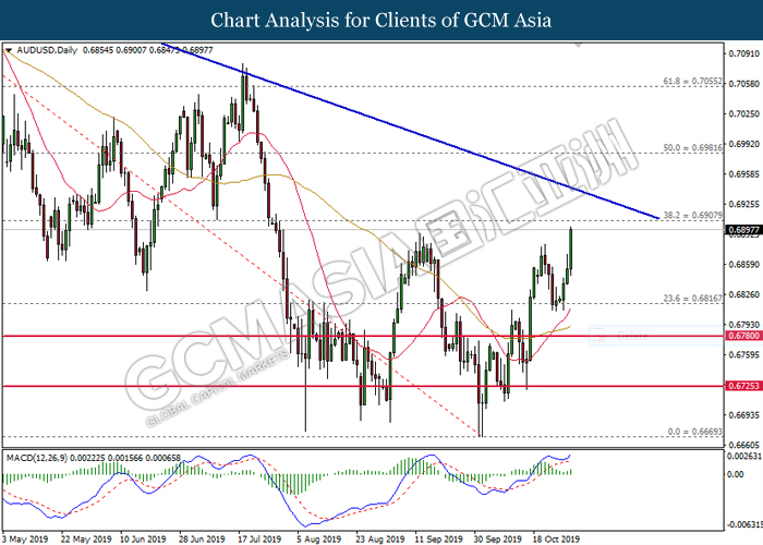 AUDUSD, Daily: AUDUSD was traded higher following prior rebound from the lower levels. MACD which illustrate bullish signal suggests the pair to extend its gains, towards the direction of 0.6910.