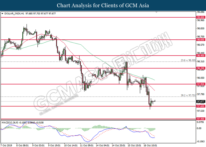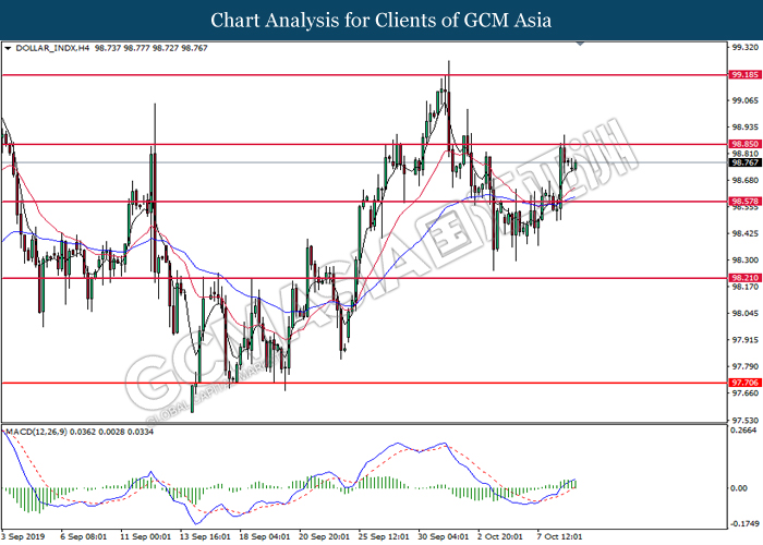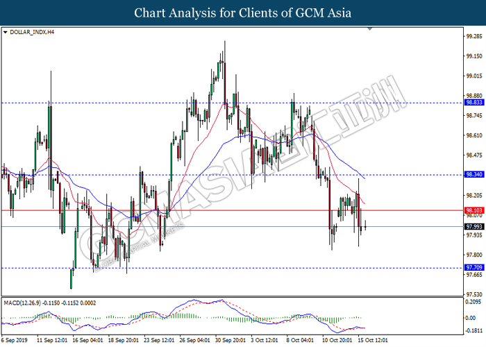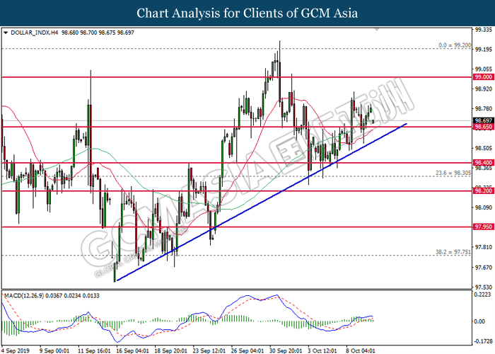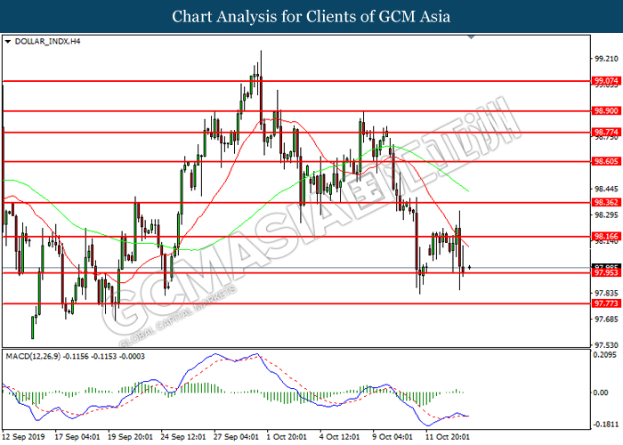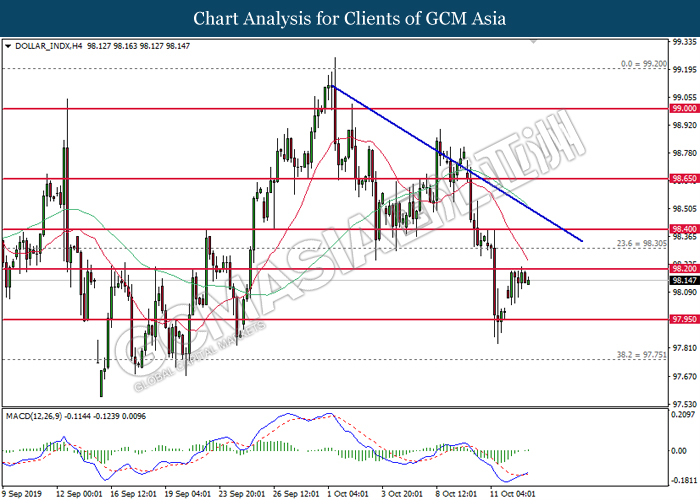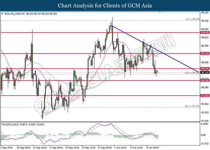 DOLLAR_INDX, H4: Dollar index was traded lower following prior retracement from the resistance level at 98.75. MACD which illustrated diminishing bullish momentum suggest the pair to extend its losses toward support level at 98.60.