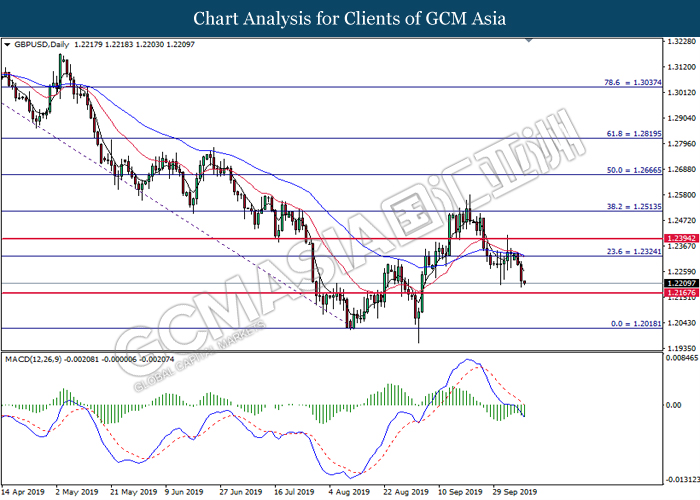 GBPUSD, Daily: GBPUSD was traded lower following prior retracement from its previous support level at 1.2270. MACD which illustrated increasing bearish momentum suggest the pair to extend its losses toward support level at 1.2210.