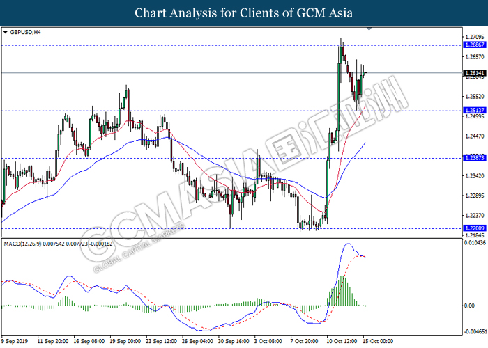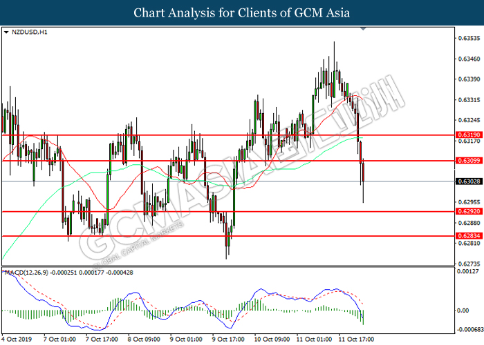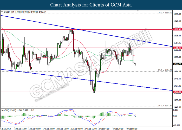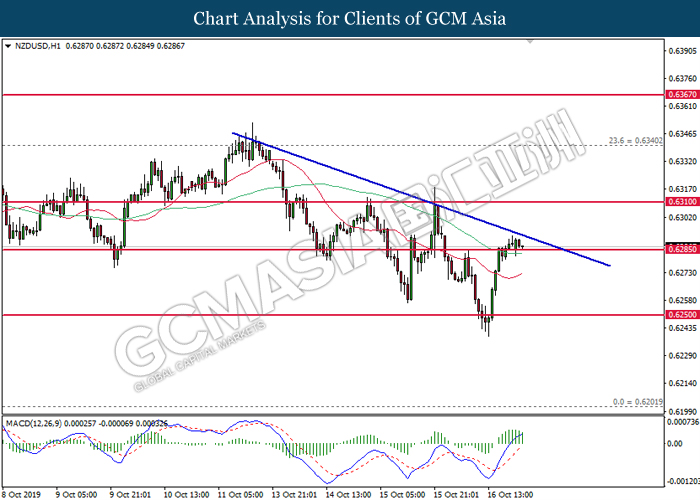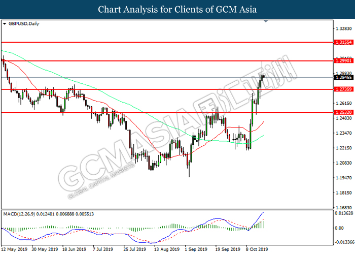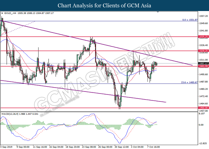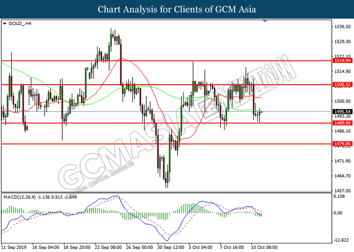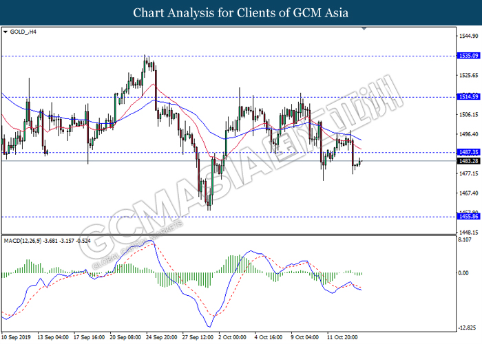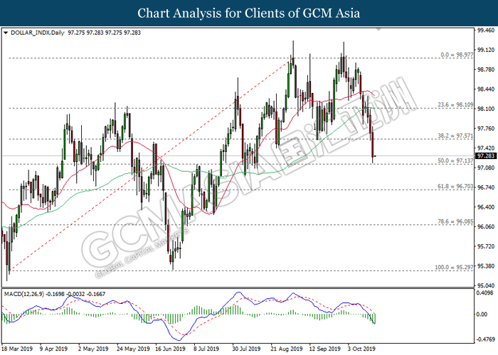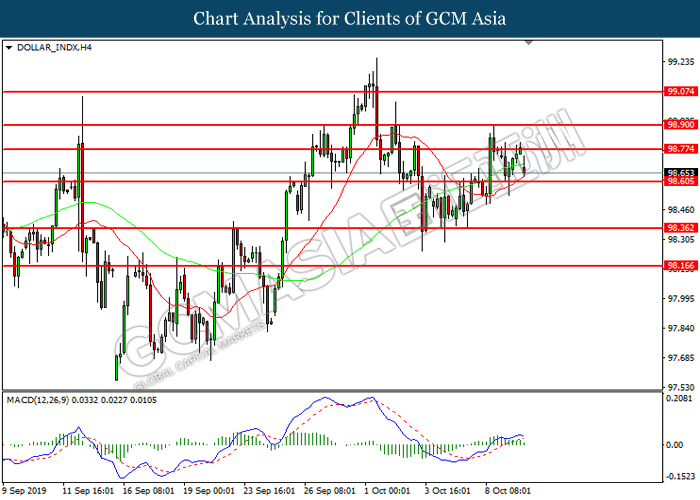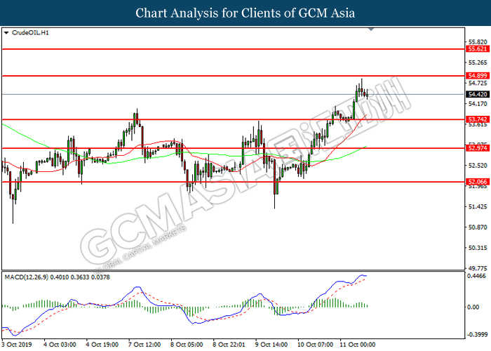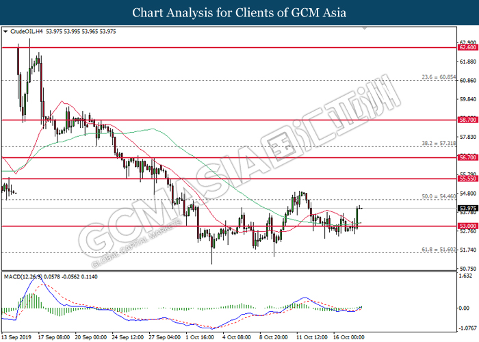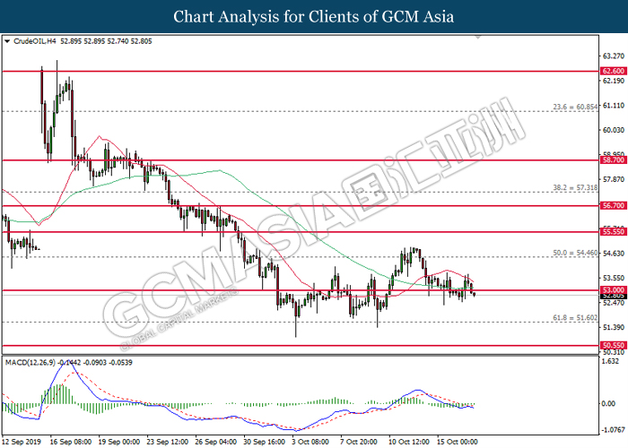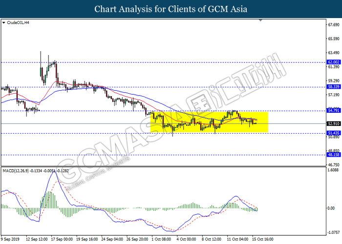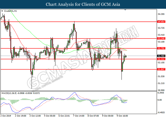 In the commodities market, crude oil price slump 0.30% to $52.42 per barrel amid to the prospect of the United States and China striking a trade deal in talks this week dimmed, raising uncertainties for global economic growth and oil demand. On the other hand, gold price rose 0.02% to $1505.63 per troy ounces amid to weaker greenback.