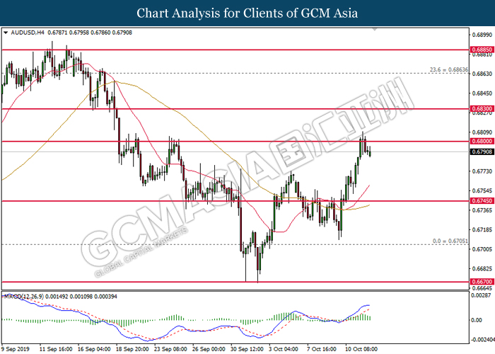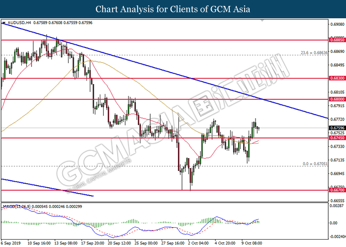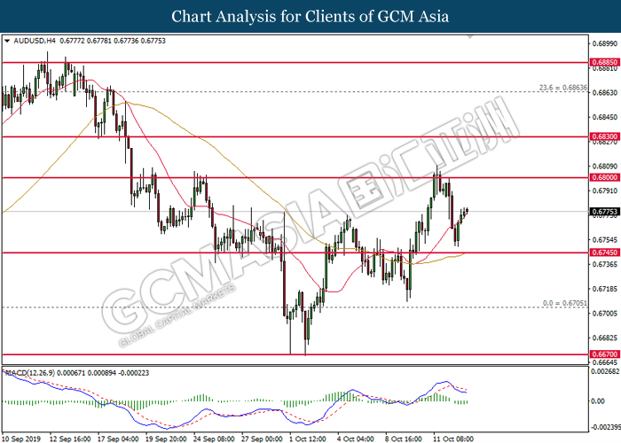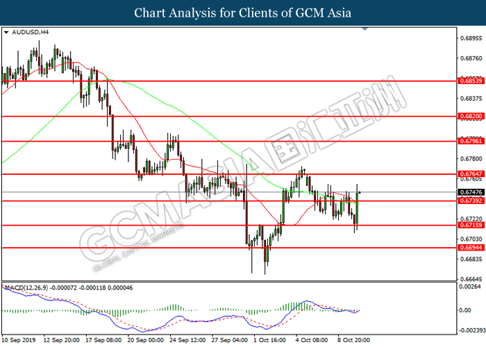 AUDUSD, H4: AUDUSD was traded higher while currently testing the resistance level at 0.6745. MACD which illustrate diminishing bearish momentum signal suggests the pair to extend its gains after successfully breakout above the resistance level at 0.6745.