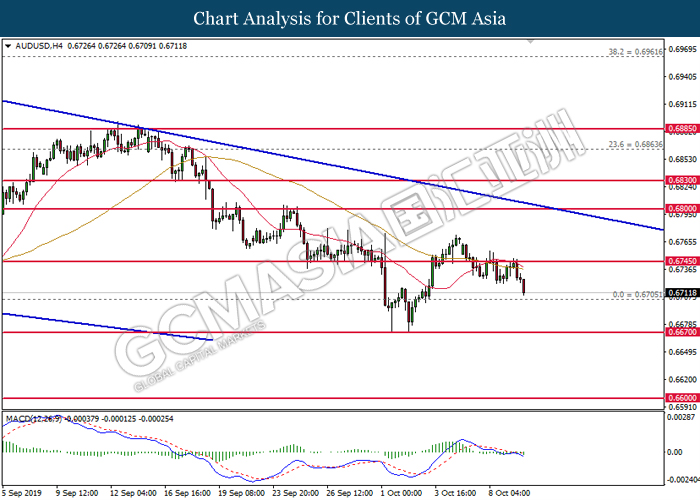 AUDUSD, H4: AUDUSD was traded lower while currently testing at the support of 0.6705. MACD which illustrate bearish signal suggests the pair to extend its losses after closing below the support level.