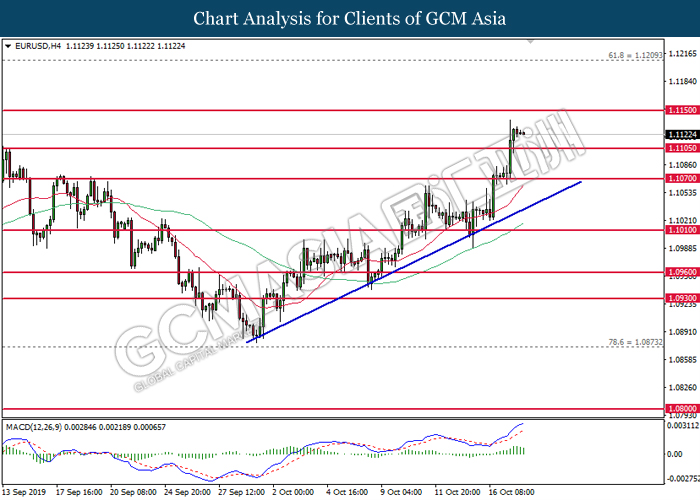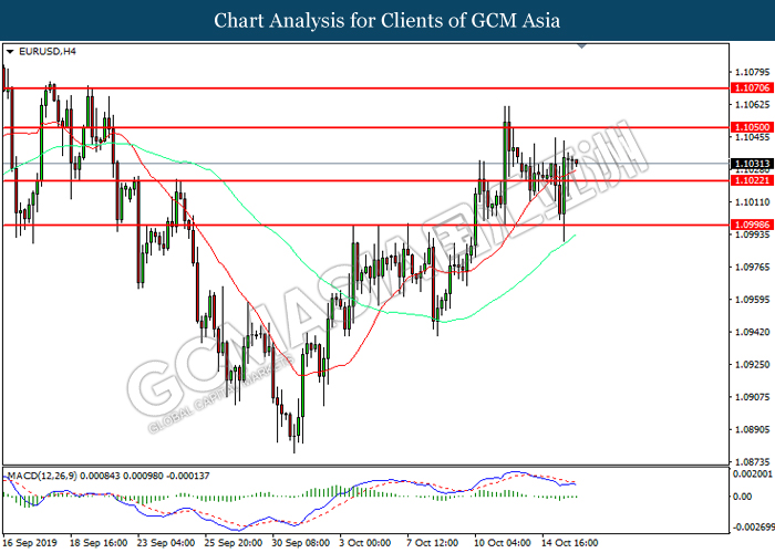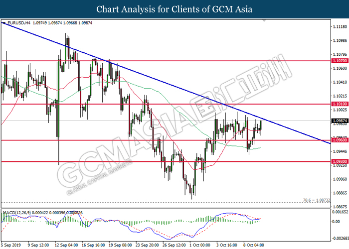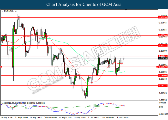 EURUSD, H4: EURUSD was traded higher while currently testing at the resistance level at 1.0995. MACD which illustrated increasing bullish momentum suggest the pair to be traded higher after it successfully breakout above the resistance level.