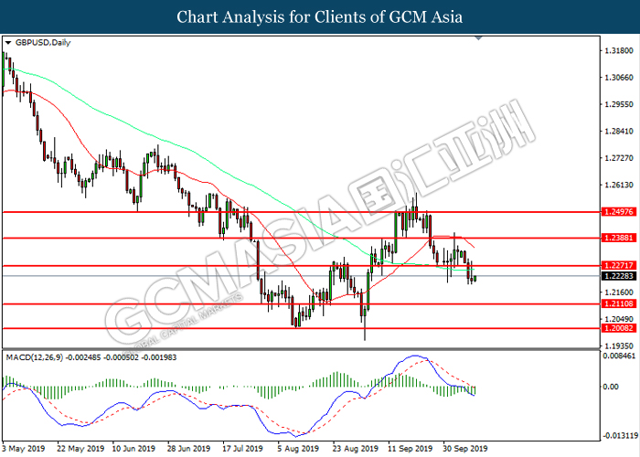 GBPUSD, H4: GBPUSD was traded flat near the support of 1.2170. MACD which illustrate diminished downward momentum suggests the pair to be traded higher in short-term as technical correction.
