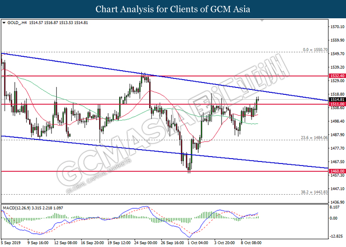 GOLD_, H4: Gold price was traded higher following prior close above 1511.00. MACD which illustrate bullish signal suggests its price to be traded higher in short-term as technical correction.
