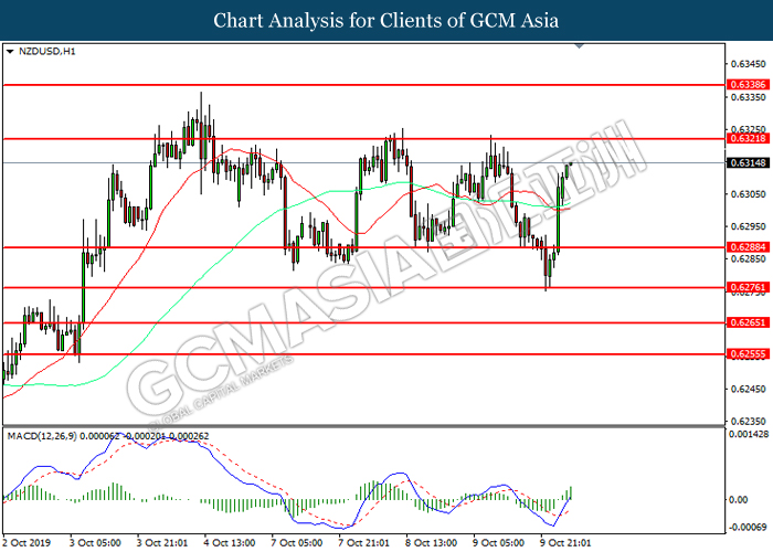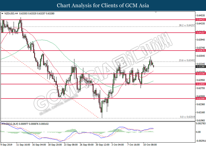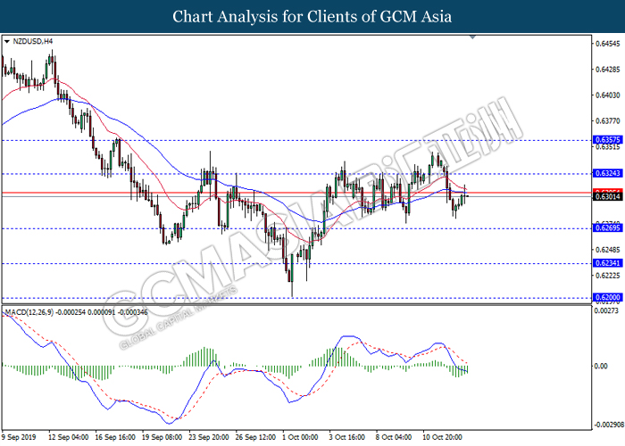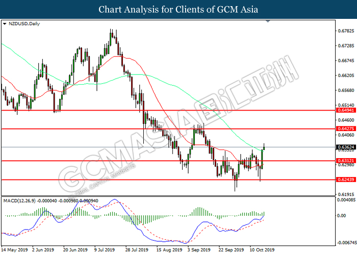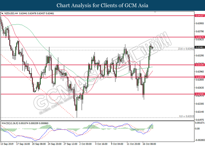 NZDUSD, H4: NZDUSD was traded higher following prior closure above 0.6340. MACD which illustrate bullish signal suggests the pair to extend its gains in mid-term, towards the direction of 0.6365.