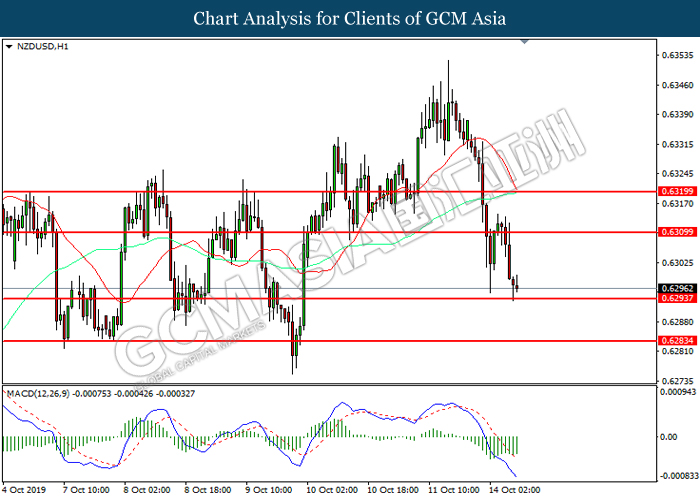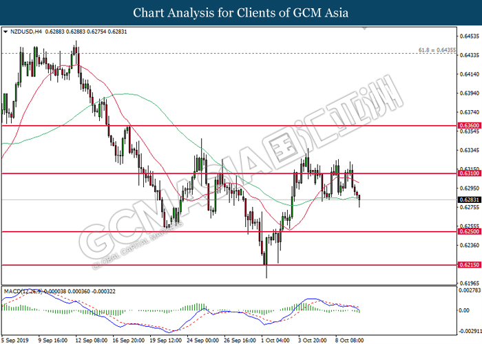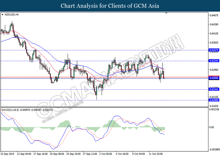 NZDUSD, H4: NZDUSD was traded lower following prior retrace from 0.6310. MACD which illustrate bearish signal suggests the pair to advance further down, towards the direction of 0.6250.