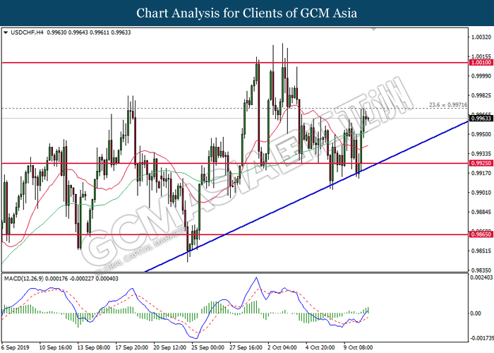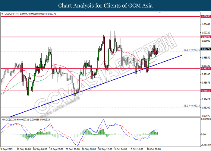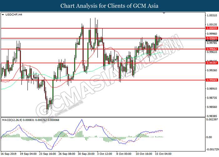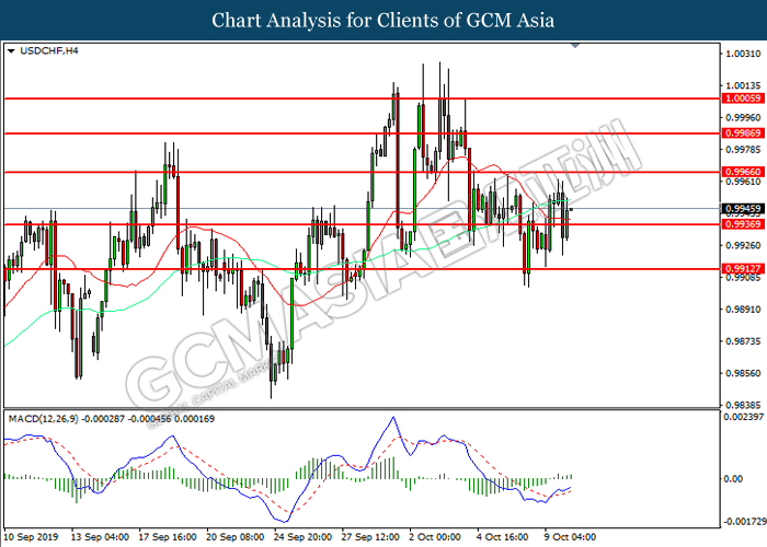 USDCHF, H4: USDCHF was traded higher following prior rebound from its support level at 0.9935. MACD which illustrated increasing bullish momentum suggest the pair to extend its gain toward the resistance level at 0.9965.
