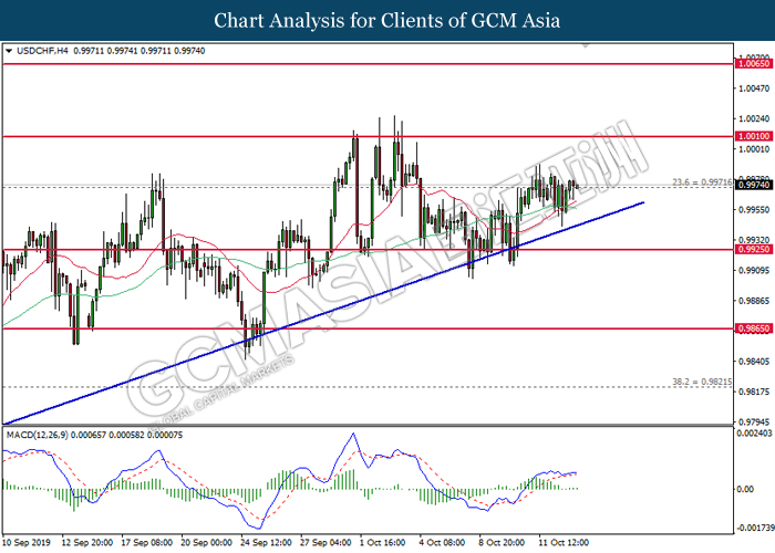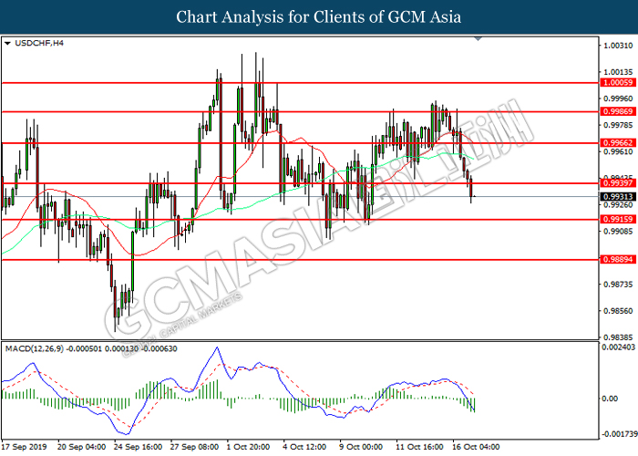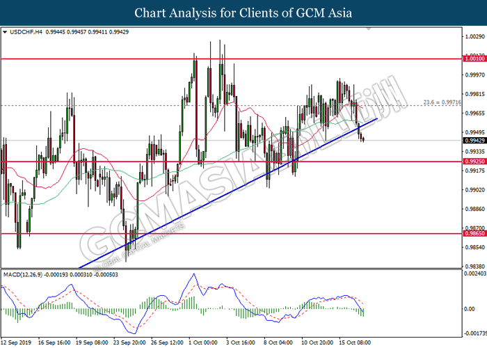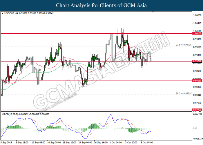 USDCHF, H4: USDCHF was traded lower while currently testing at the support of 0.9925. MACD which illustrate bearish signal suggest the pair to extend its losses after closing below 0.9925.