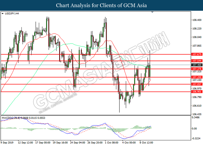 USDJPY, H4: USDJPY was traded lower while currently testing at the support of 107.05. MACD which illustrate diminished upward momentum suggests the pair to extend its losses after breaking the support level.