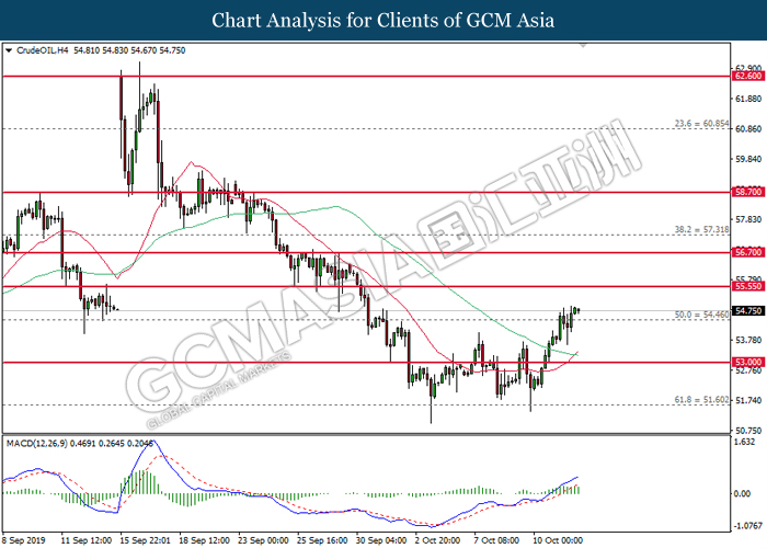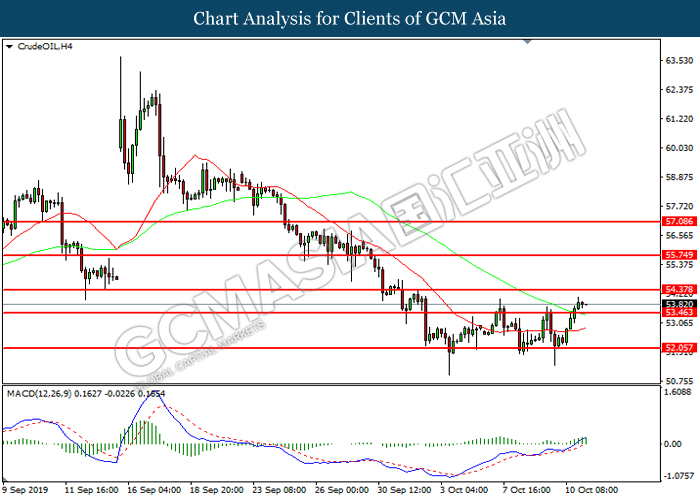 CrudeOIL, H4: Crude oil price was traded higher following prior rebound from the lower level. MACD which illustrate bullish signal suggests its price to be traded higher, towards the direction of 54.45.