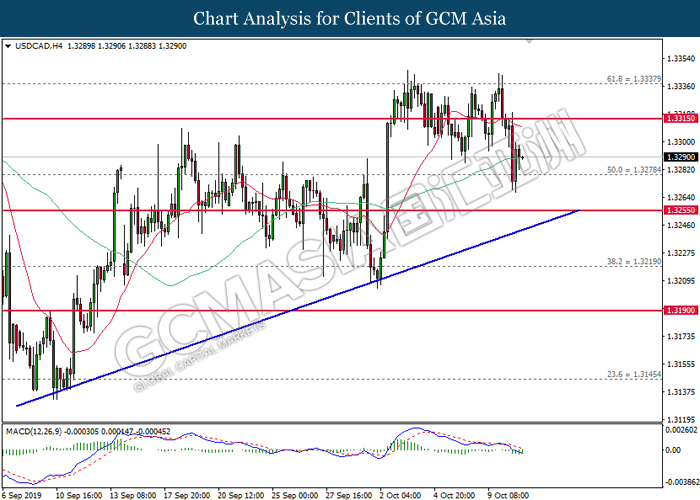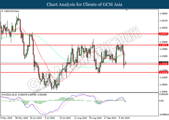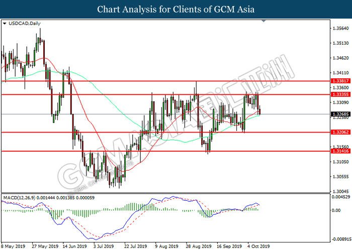 USDCAD, H4: USDCAD was traded lower following prior retracement from the resistance level at 1.3335. MACD which illustrate bearish bias momentum suggest the pair to extend its losses toward the support level at 1.3275.