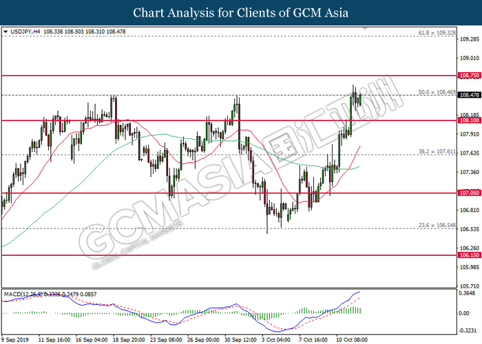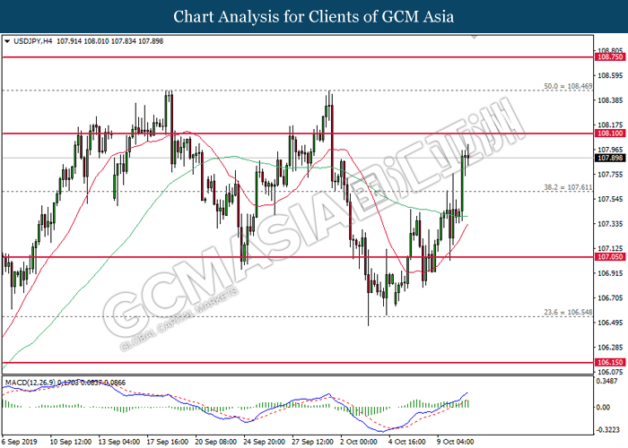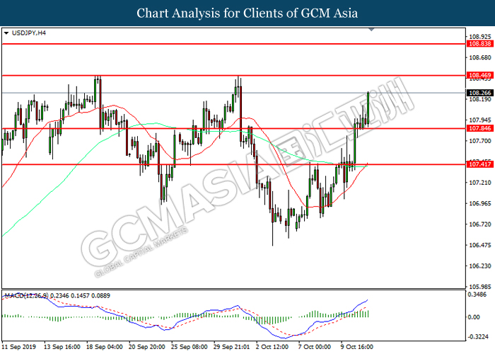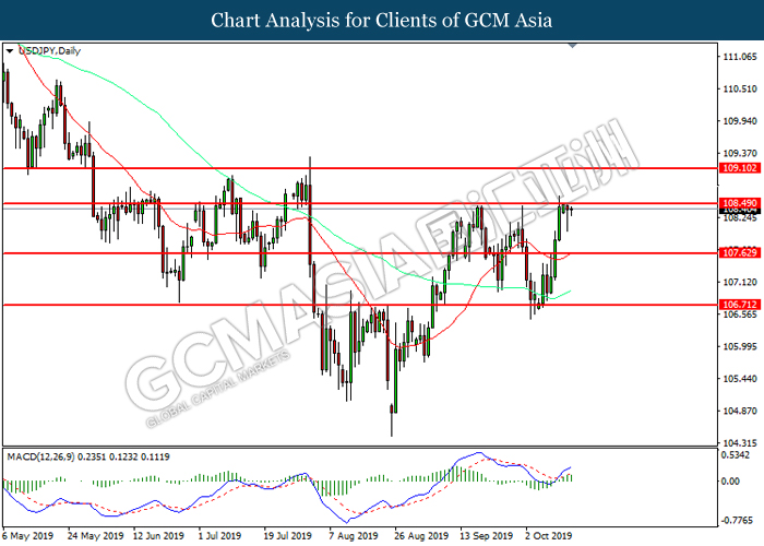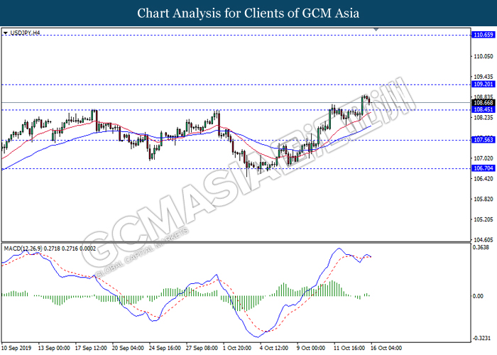 USDJPY, Daily: USDJPY was traded higher while currently testing the resistance level at 108.80. MACD which illustrated increasing bullish momentum suggest the pair to extend its gains after it successfully breakout above the resistance level.