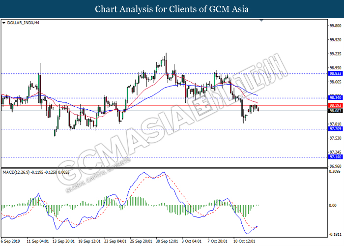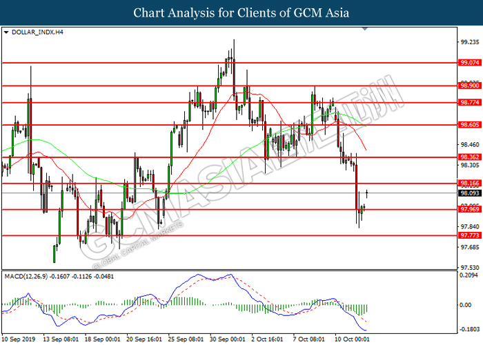 US dollar depreciates slightly against other major currencies on yesterday while investors scrutinize the upcoming high-level trade talk and the release of Federal Reserve meeting minutes. According to South China Morning Post, both US and China make no progress with regards to key trade issue over the past two days of deputy-level talks. Chinese delegation refused to discuss about forced technology transfer, one of the key trade talk agenda from the United States. Likewise, China expressed their disappointment over US announcement to blacklist a list of Chinese companies last Monday, while expressing their pessimism to achieve any trade deal breakthrough for the week. On the other hand, the release of Federal Reserve meeting minutes shows similar bearish tone among its policymakers. The Fed sees risks to continue surrounds the US economy although it is still far from plunging into a recession. However, several policymakers favor to keep their interest rate unchanged for the time being as they believe baseline economic projection did not stray off too much for the time being. On the other hand, pound sterling continues to be subjected by bearish pressure after UK and EU Brexit talks falters just a few weeks before 31st October deadline. Both sides struggled to achieve a consensus over Ireland backstop issue with EU insisting for border controls without additional checks while Northern Ireland remains in a custom union until an alternative has been found. As of writing, the dollar index fell 0.02% to 98.78 while EUR/USD rose 0.14% to 1.0984.