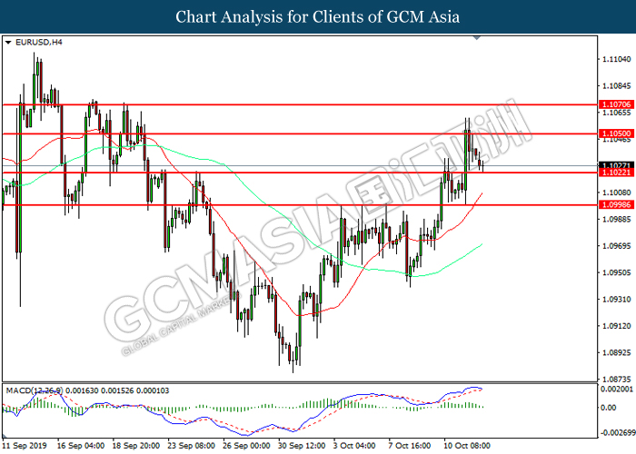 EURUSD, H4: EURUSD was traded higher following prior breakout at 1.1105. However, MACD which illustrate diminished upward momentum suggests the pair to be traded lower in short-term as technical correction.