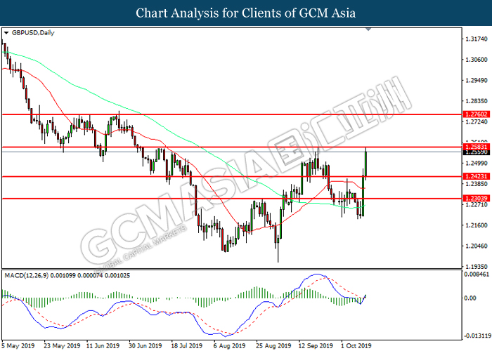 GBPUSD, Daily: GBPUSD was traded higher following prior breakout above the previous resistance level at 1.2735. MACD which illustrated increasing bullish momentum suggest the pair to extend its gain toward the resistance level at 1.2990.