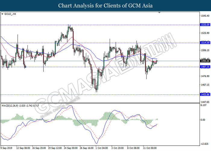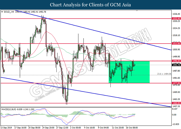 GOLD_, H4: Gold price remains traded within a sideways channel formation. MACD which illustrate bullish signal suggests its price to extend its gains, towards the direction of 1496.00.