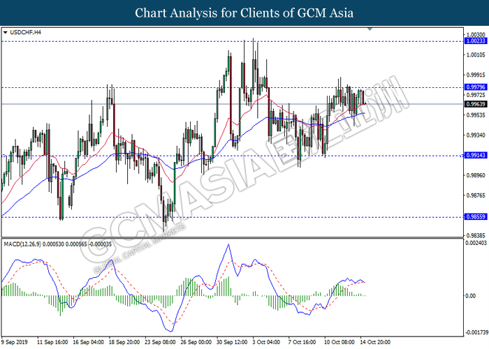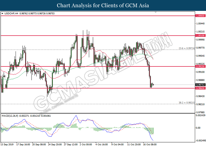 USDCHF, H4: USDCHF was traded lower while currently testing at 0.9865. MACD which illustrate bearish signal suggests the pair to extend its losses after closing below 0.9865.