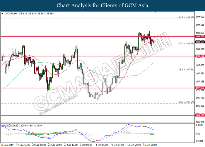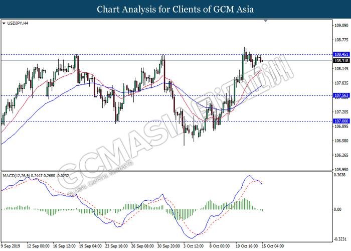 USDJPY, H4: USDJPY was traded lower following prior retracement from the resistance level at 108.90. MACD which illustrated the bearish signal suggested the pair to be traded lower toward support level at 108.20.