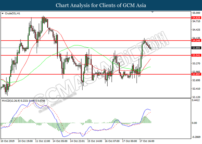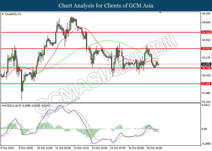 CrudeOIL, H1: Crude oil price was traded lower following prior retracement from the resistance level at 54.05. MACD which illustrated diminishing bullish momentum suggest the commodity to extend its losses toward support level at 53.55.