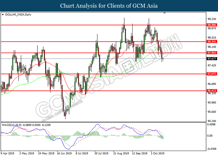 DOLLAR_INDX, Daily: Dollar index was traded lower following prior breakout below the previous support level at 97.90. MACD which illustrated increasing bearish momentum suggest the pair to extend its losses toward support level 97.05.