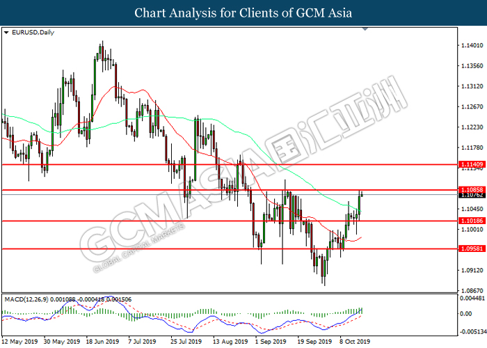 EURUSD, Daily: EURUSD was traded higher while currently testing the resistance level at 1.1085. MACD which illustrated increasing bullish momentum suggest the pair to extend its gain after it successfully breakout above the resistance level.