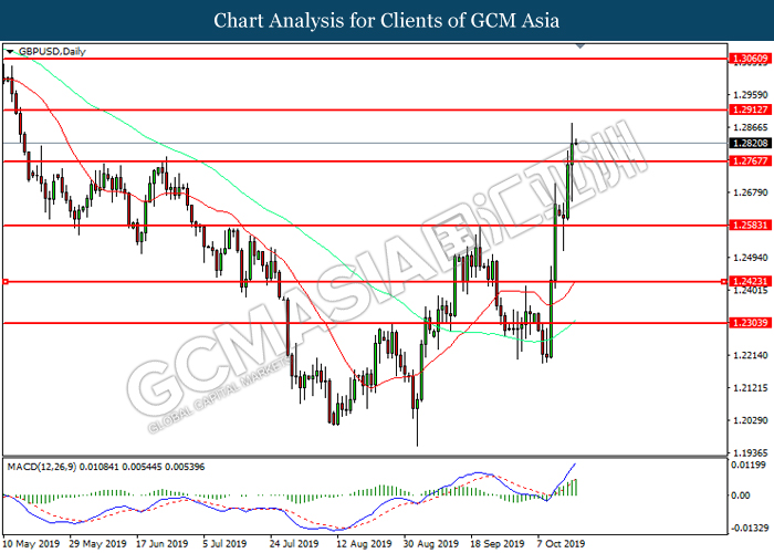 GBPUSD, Daily: GBPUSD was traded higher following prior breakout above the previous resistance level at 1.2765. MACD which illustrated increasing bullish momentum suggest the pair to extend its gains toward resistance level at 1.2915.