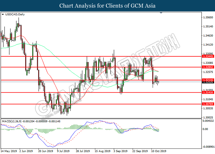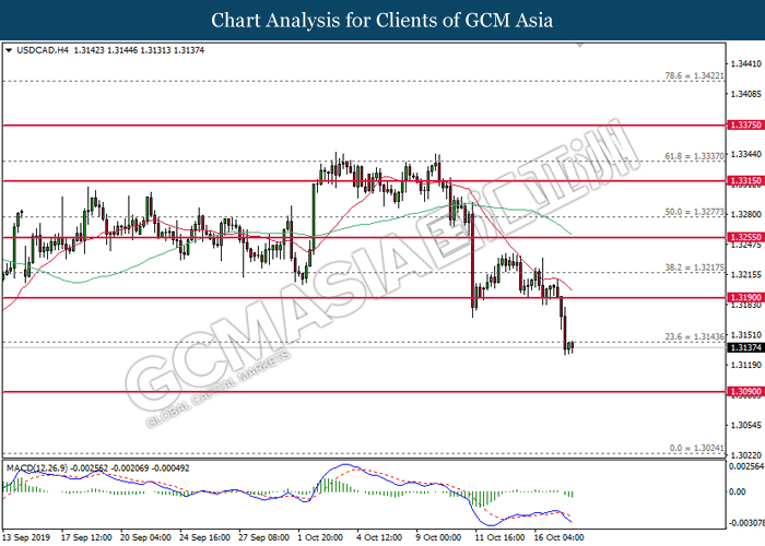 USDCAD, H4: USDCAD was traded lower following prior closure below 1.3145. MACD which illustrate bearish signal suggests the pair to extend its losses in mid-term, towards the direction of 1.3090.