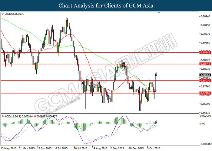 AUDUSD, Daily: AUDUSD was traded higher following prior breakout above the previous resistance level at 0.6800. MACD which illustrated increasing bullish momentum suggest the pair to extend its gains toward resistance level at 0.6875.