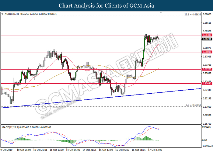 Australian dollar which traded against the dollar manage to hold its gains despite recent release of weak GDP data from China. According to the National Bureau of Statistics of China, GDP in annual basis have slumped to 6.0%, lower than expected reading of 6.1%. Despite that, downbeat data from U.S coupled with recent positive developments in trade talk allow the Aussie and Kiwi bulls to remain dominant in the market. According to reports, Chinese Commerce Ministry Spokesman have stated that they hope to reach the phased trade deal with U.S as soon as possible. Following China is one of the largest trade partner to the antipodeans, both Aussie and Kiwi also benefitted from the development. As of writing, AUD/USD rose 0.18% to 0.6833 while NZD/USD also climbs 0.11% to 0.6369.