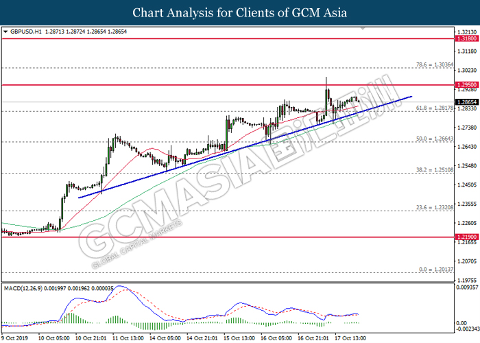 Greenback remains under pressure on Thursday while pound sterling extended gains due to positive report with regards to Brexit. On yesterday, European Union Commission President Jean-Claude Juncker and UK Prime Minister Boris Johnson announced their agreement via Twitter. The Withdrawal Agreement was also approved by EU leaders during their summit on Thursday, while the UK would need to pass it through its Parliament in the weekends. However, Northern Ireland’s Democratic Unionist Party expressed their opposition on the agreement, making it uncertain if the deal could be passed when voting is being initiated on this Saturday. The deal would require Northern Ireland to apply limited set of EU rules upon certain goods, with the UK charging EU tariffs upon goods passing into the EU markets. In addition, Northern Ireland will have their rights to vote every four years if the agreement would stay. As of writing, pair of GBP/USD depreciates by 0.13% to 1.2871. On the other hand, greenback extended its losses after Philadelphia Fed Manufacturing Index slumped to 5.6 for the month of October, missing economists’ forecast of 7.3. The depreciation in its activity were mainly contributed by lower shipments activity and average workweek. The dollar index fell 0.45% to 97.27.