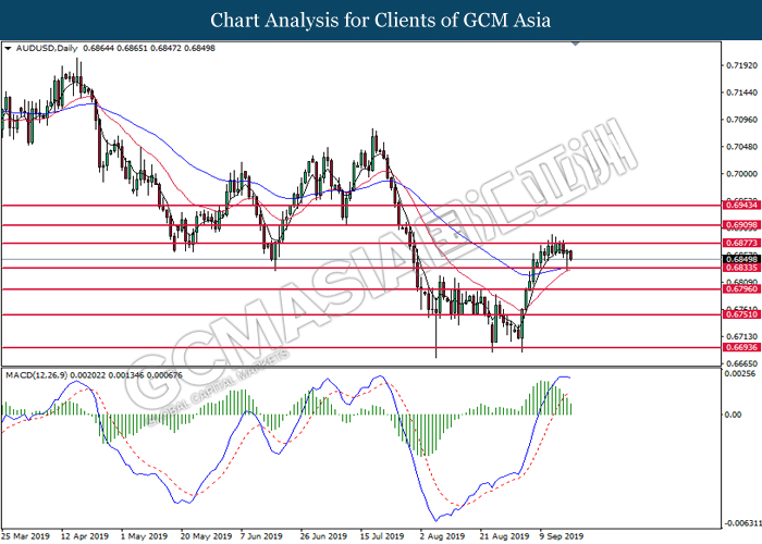 AUDUSD, Daily: AUDUSD was traded lower following prior retracement from the resistance level at 0.6875. MACD which illustrate diminished upward momentum suggest the pair to extend its losses toward the support level at 0.6835.