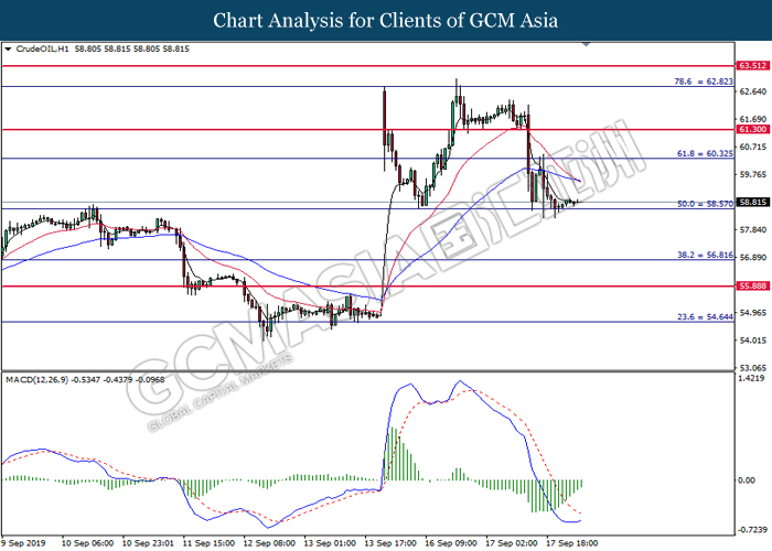 CrudeOIL, H1: Crude oil price was traded higher following prior rebound from the support level at 58.55. MACD which illustrate diminished downward momentum suggests the commodity to extend its gains toward the resistance level at 60.35.