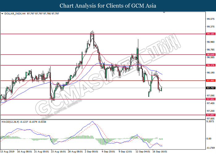 DOLLAR_INDX, H4: Dollar index was traded lower following prior retracement from the resistance level at 98.80. MACD which illustrate diminishing bullish momentum suggest the dollar to extend its losses toward the support level at 98.40.