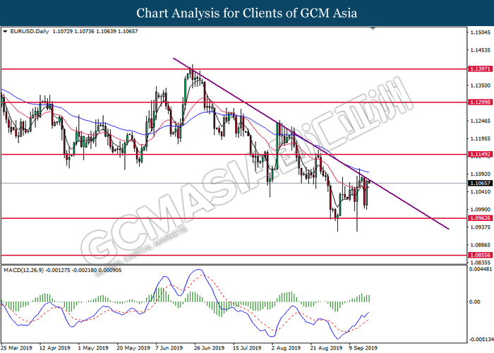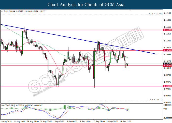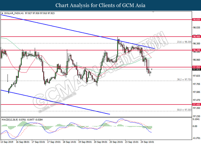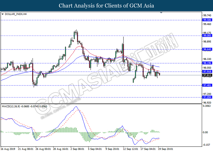 Greenback extended its recent uptrend despite a slower economic growth and rising political uncertainty. According to Bureau of Economic Analysis, US economy expanded at a rate of 2.0% for the second quarter, well within economists’ forecast. However, the data portrays a significant depreciation when compared to first quarter which expanded at the rate of 3.1%. Nonetheless, investors remained optimistic over US economic growth due to diminishing US-China trade war which may lead to a possible truce sooner than later. Yet, greenback’s bullish momentum was remained capped after a nine-page whistle-blower document which details concern over US President Donald Trump’s misuse of power were released to the public. The document not only details Trump’s call to Ukraine’s President on 25th July, it also alleges his administration’s effort to suppress records related to their conversation. On the other hand, euro extended its losses and hit a fresh new low for the year 2019 due to bleak economic outlook towards the single economy. Rising uncertainty over European Central Bank’s policy and bearish economic data from the region has encourage investors to flock towards other assets in the financial market. As of writing, the dollar index was quoted up 0.17% to 98.78 while EUR/USD was down 0.01% to 1.0920.